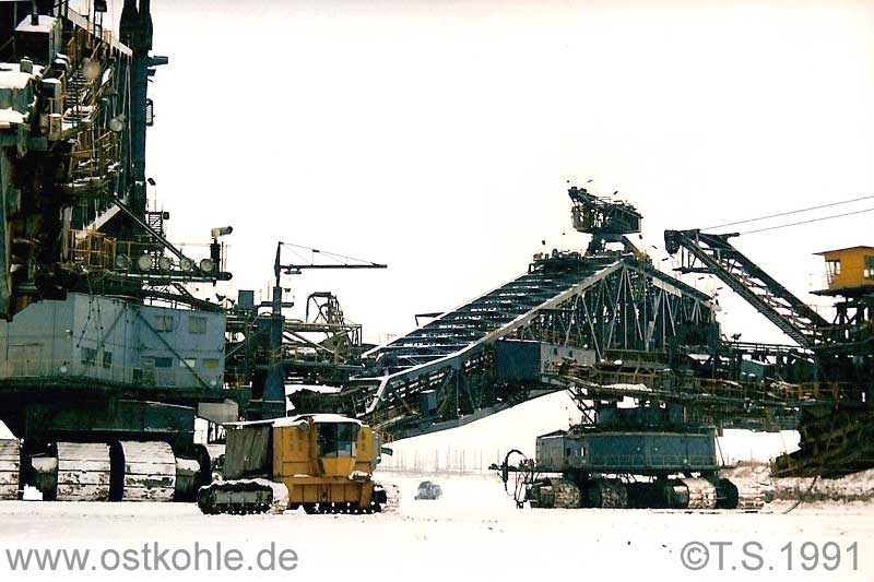 Bagger 1550 mit Verladegerät und davor eine Kabeltrommelraupe
