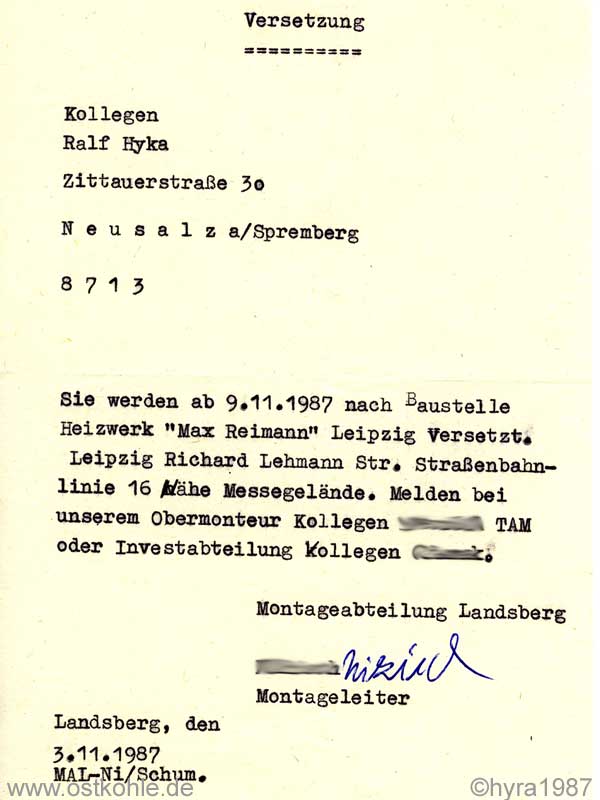 Versetzung zur Baustelle “Max Reimann” zum Bau der Bekohlungs- und Entaschungsförderanlagen