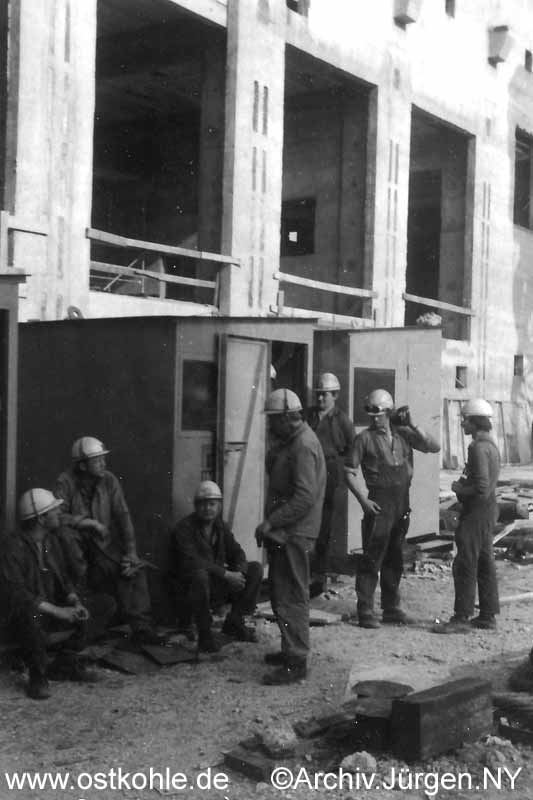 Kollegen von IMO Mitte an ihrer Baubude vor dem Bunkerschwerbau Werk III