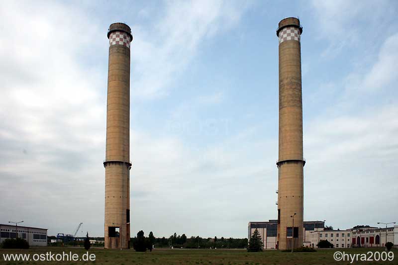 Die beiden verbliebenen 100 m hohen Schornsteine das Gasturbinenkraftwerkes