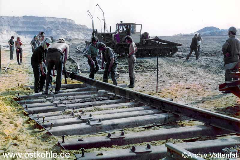 Gleisbaubrigade bei Gleisbauarbeiten mit Raupe und Rückschlepper