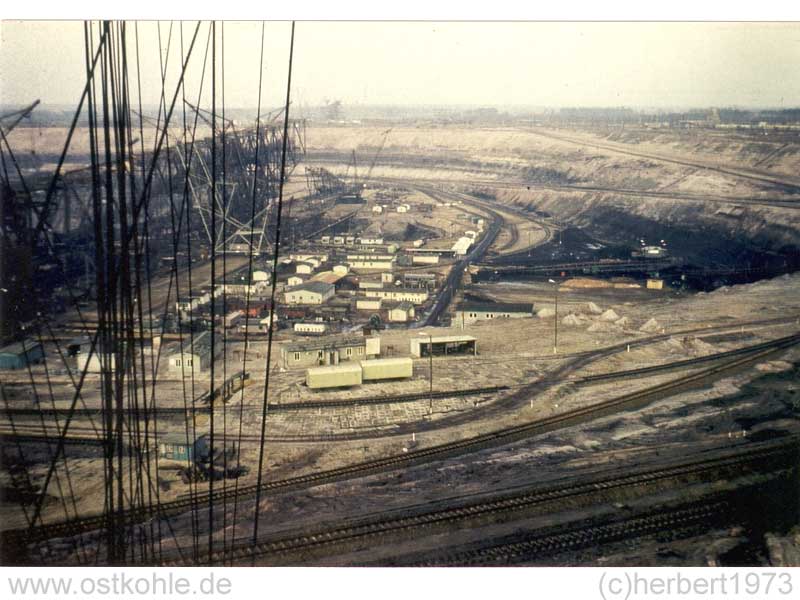Rechts, in der Mitte, das Kohleband in Richtung Verladung Mühlrose. Das Band führte unterirdisch durch den Montageplatz. Oben in der Mitte ist der Montageplatz der Es 3150. Rechts der Schacht I Mühlrose.