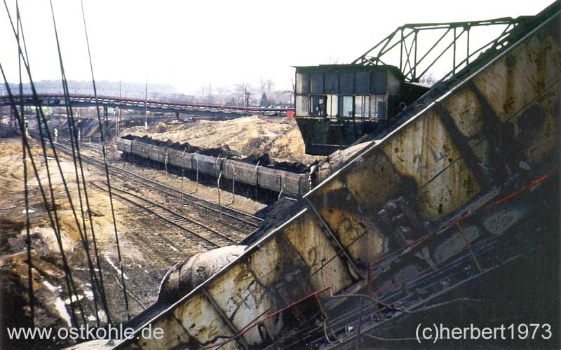 Hinter der Bandbrücke die Häuser von Mühlrose. In der Mitte der Abraumzug in Richtung Außenkippe Mulkwitz.