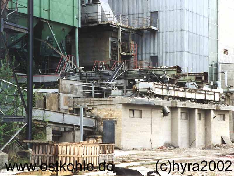 Die oberen Trogkettenförderer transportierten die Trockenasche, der unten aus dem Gebäude Kommende die Naßasche zu jeweiligen Silo