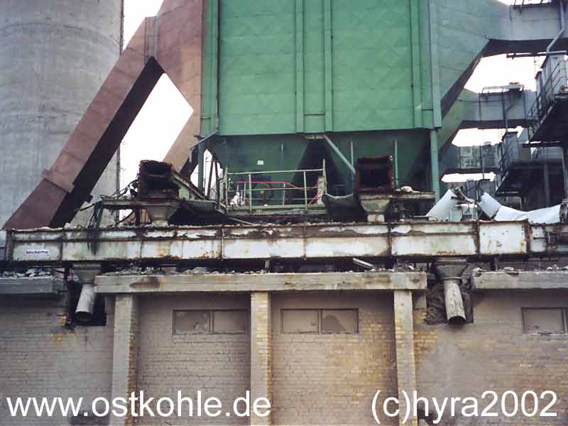 Unter dem E-Filter die von uns gebauten Trogkettenförderer - am Fotostandpunkt befand sich das Trockenaschesilo (ca. 30m hoch) - die zwei Rohre mündeten in je ein Becherwerk