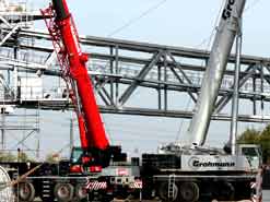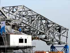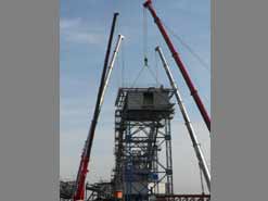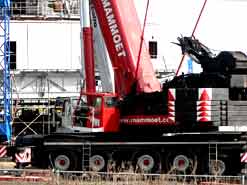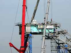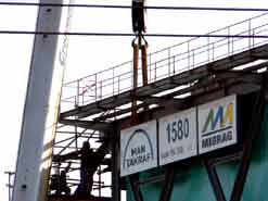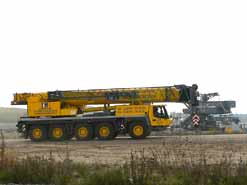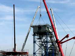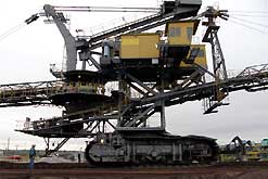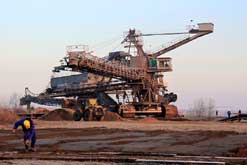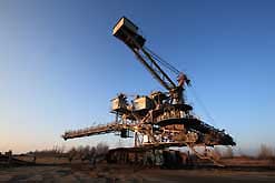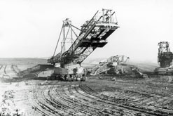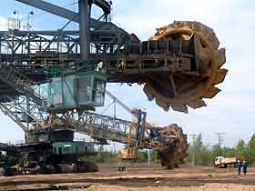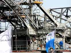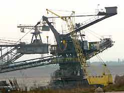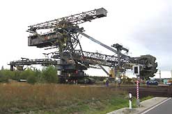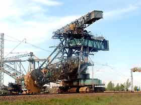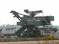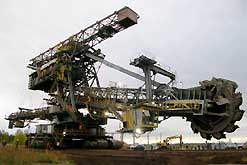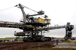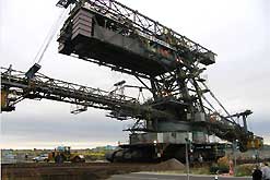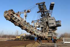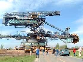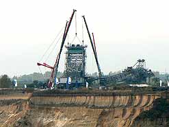 Am 20. Oktober 2005 hieven drei Großkräne den fast 100 Tonnen schweren Gegengewichtsausleger auf den 30 Meter hohen Baggeroberbau. Anschließend verschrauben und vernieten die Mitarbeiter von MAN TAKRAF die beiden Hauptteile des Großgeräts. Damit ist das Skelett des 35 Meter hohen und 150 Meter langen Schaufelradbaggers fast komplett. Im Juni 2006 wird er mit der Abraumförderung im Abbaufeld Schwerzau des Tagebaus Profen beginnen. Quelle: www.mibrag.de