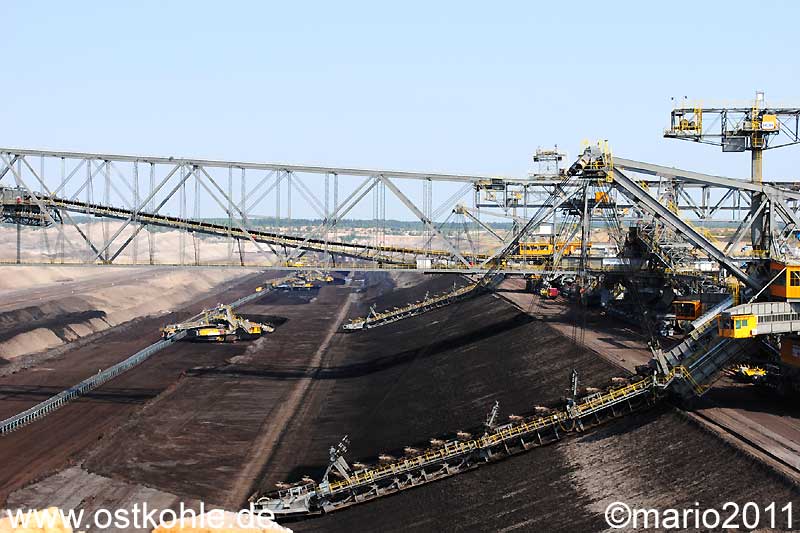 Bagger 1575 SRs 702 in der Kohle und die Eimerkettenbagger 1305 Es 3750 vor und 1302 hinter der Brücke