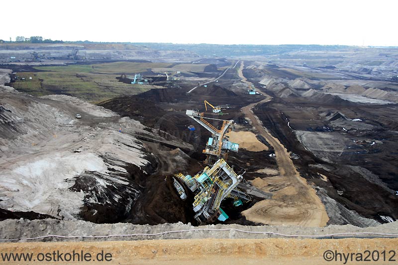 Blick vom Aussichtspunkt bei Deutzen in den Tagebau mit den havarierten Großgeräten