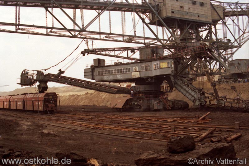 Eimerkettenbagger 300 ERs 500 im Tiefschnitt beim Zug beladen, dahinter die F 34 Nr. 25